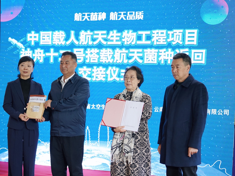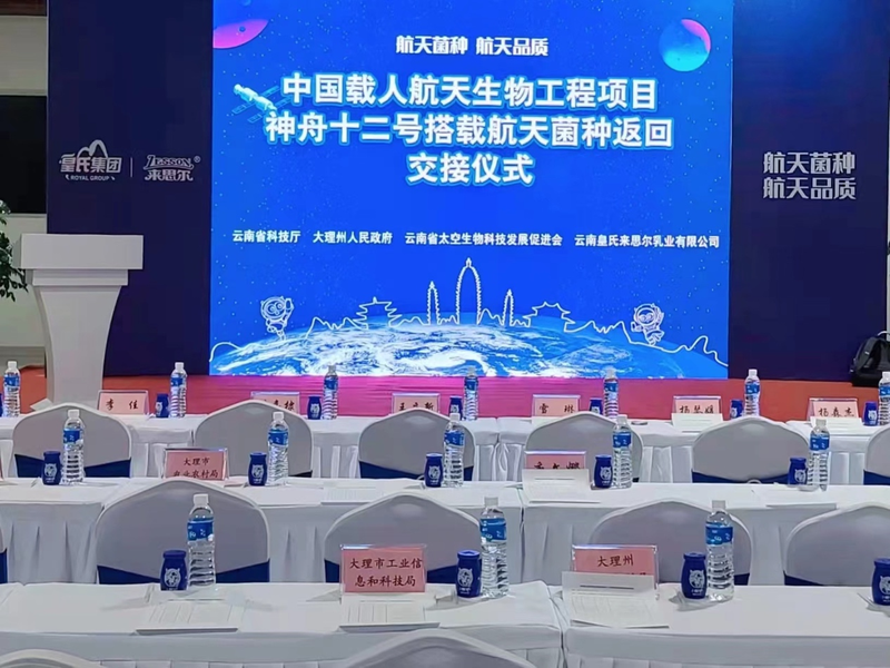 2021年9月27日,在北京中国载人航天办公室举行的神舟十二号飞船返回舱开舱及搭载物交接仪式上,皇氏来思尔总经理马万平带领着研发人员亲自赴京,迎接顺利从太空凯旋归来的22株菌种。随后,航天菌种鲜活菌被送返云南,经过一系列技术处理后,于12月1日正式回到大理。为迎接航天菌种的顺利回归,由云南省科技厅、大理白族自治州人民政府、云南省太空生物科技发展促进会主办,云南皇氏来思尔乳业有限公司承办,在大理举行“中国载人航天生物工程项目神舟十二号搭载航天菌种返回交接仪式”。