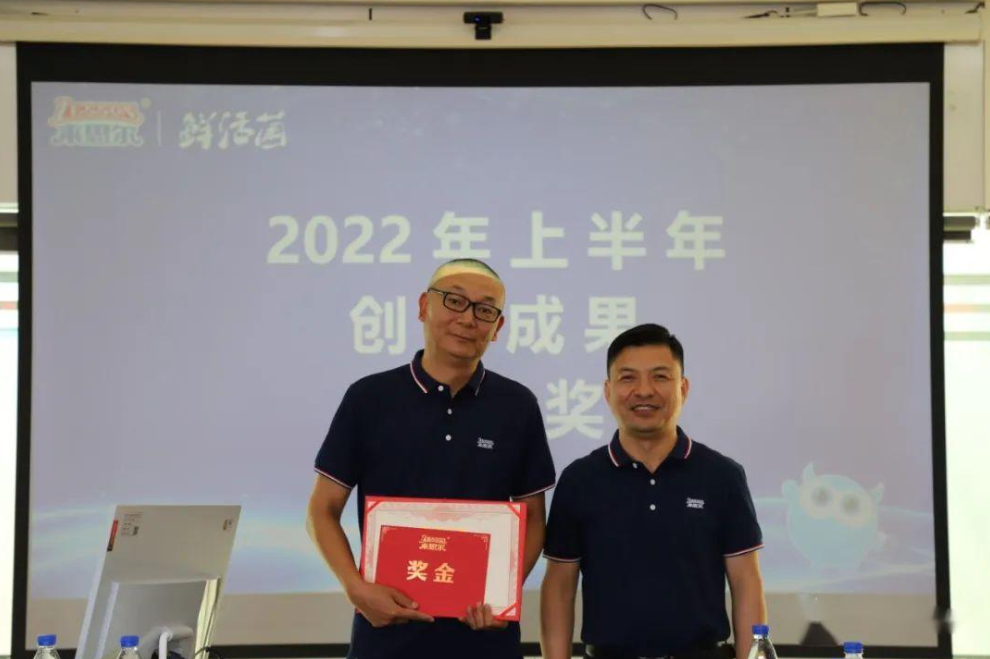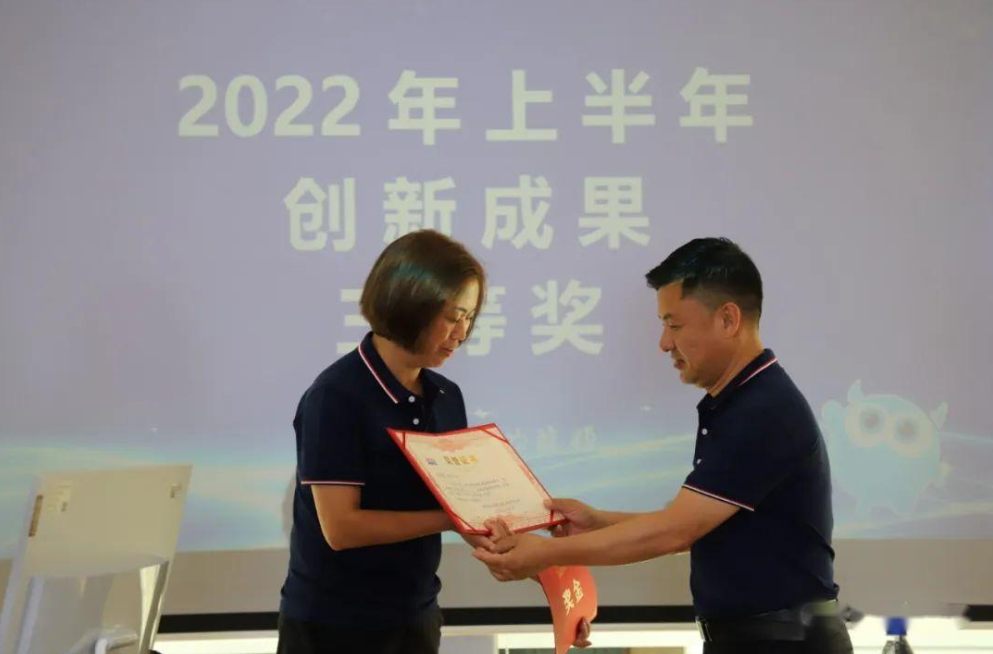 各部门汇报结束后,评审组评选出金点子奖一名,创新成果奖一等奖一名,二等奖一名,三等奖二名,上半年创新先进团队一名,并由马总亲自为他们颁奖。