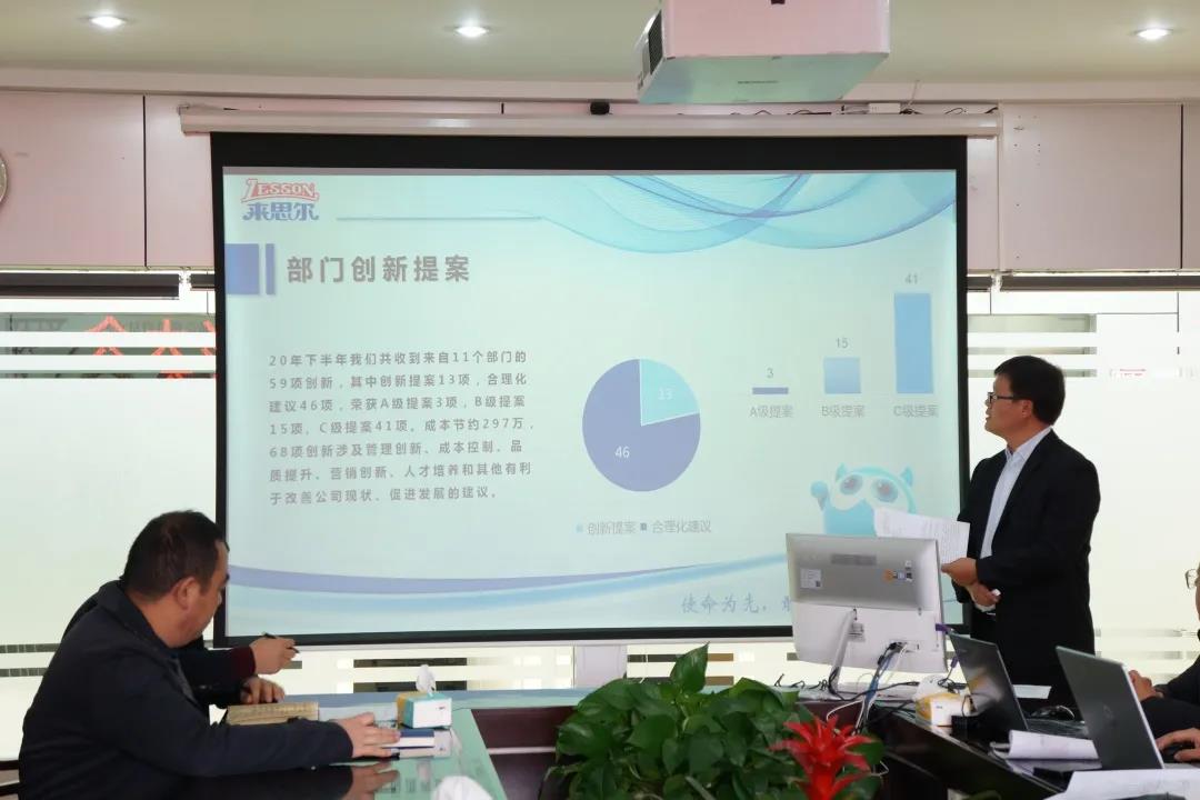 为贯彻执行来思尔 “变革、创新、共赢”的工作主题,激发员工创造性,提升员工改革创新精神,提高公司经济效益,1月12日,来思尔乳业召开了2020年下半年创新活动总结暨表彰会议,公司领导班子成员、创新提报人及部分员工代表参加了会议。 会上主持人详细介绍了公司下半年创新工作执行情况。下半年来思尔共开展各类创新59项,11个部门积极参与,其中创新改进项目13项,合理化建议46项,被评定为A级提案3项,B级提案15项, C级提案41项。59项创新涉及管理创新、成本控制、品质提升、营销创新、人才培养和其他有利于改善公司现状、促进发展的建议。下半年通过创新累计为公司节约各项成本支出297万。
